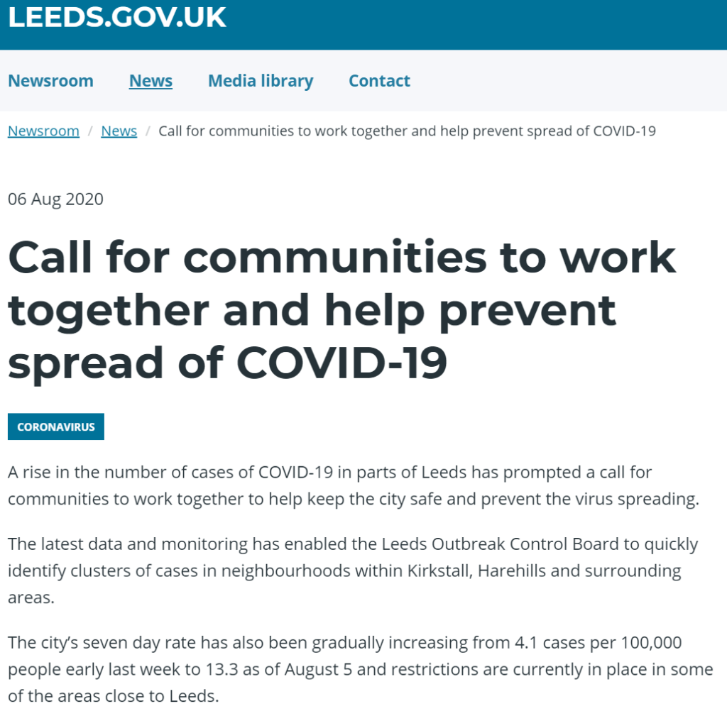 News is breaking that there are early signs pointing to a rise in cases. With the cases per 100,000 people rising from 4.1 to 13.3 across Leeds, with particular focus in Kirkstall, but parts of Harehills and other areas in the city are seeing rises too.