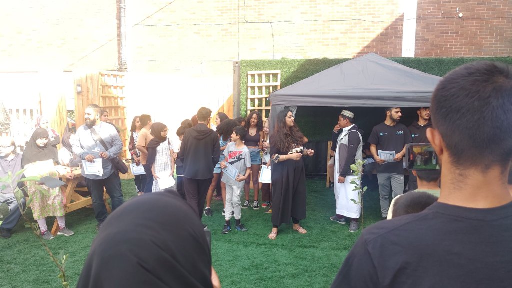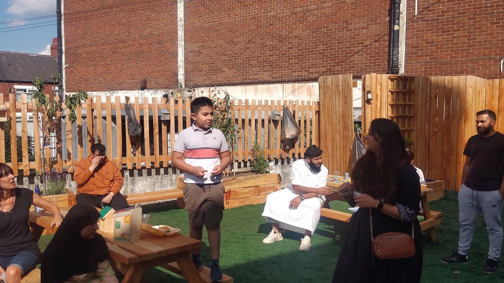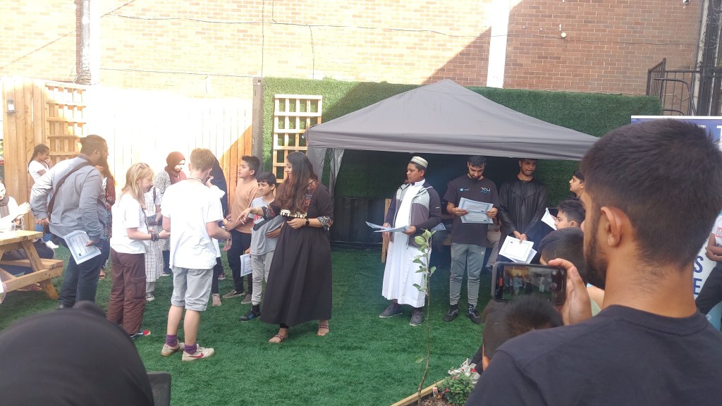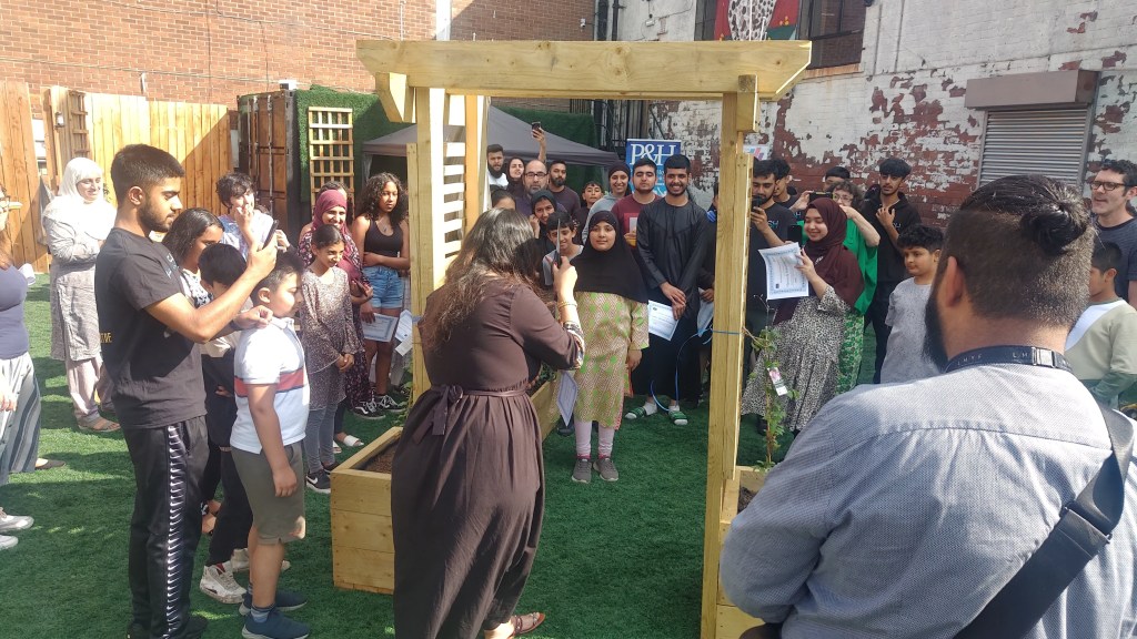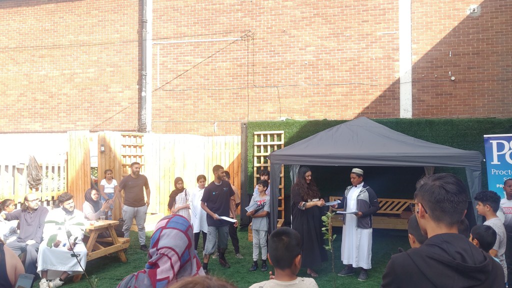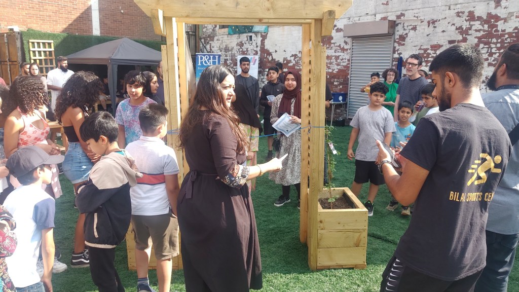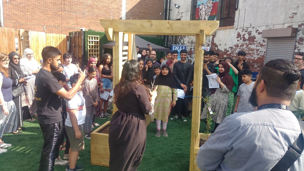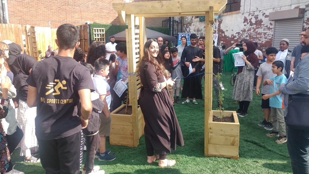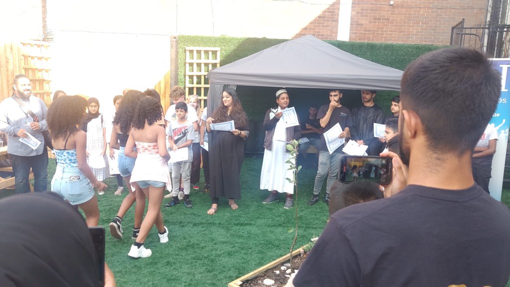 Amazing weather deserving of a grand garden party to open such a lovely space. So many people were there, and Councillor Salma Arif was there to cut the ribbon and later present certificates to the young people who have done so much.