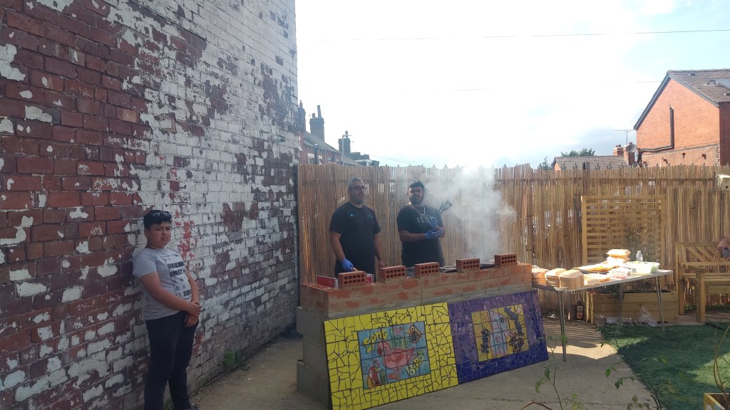 The young people, their supporters at Junior Sports Hub and Breaking Down Barriers, Woodcraft Folk, and Back to Front set about turning this drab concrete into a community garden and barbecue in a fantastic transformation.
