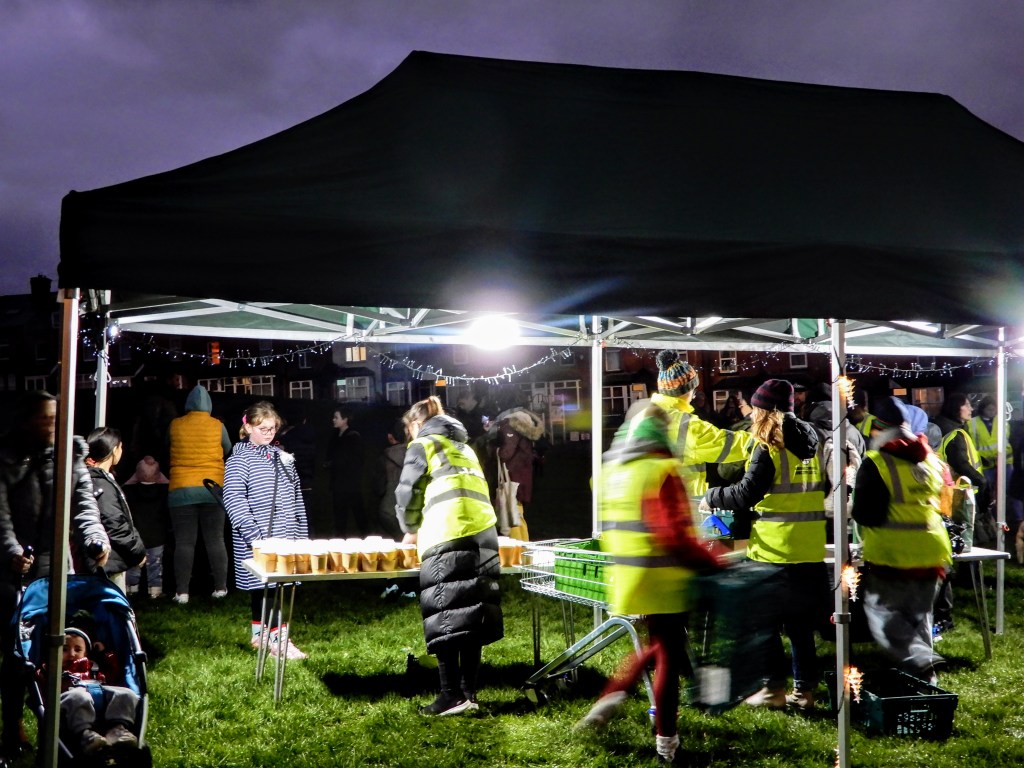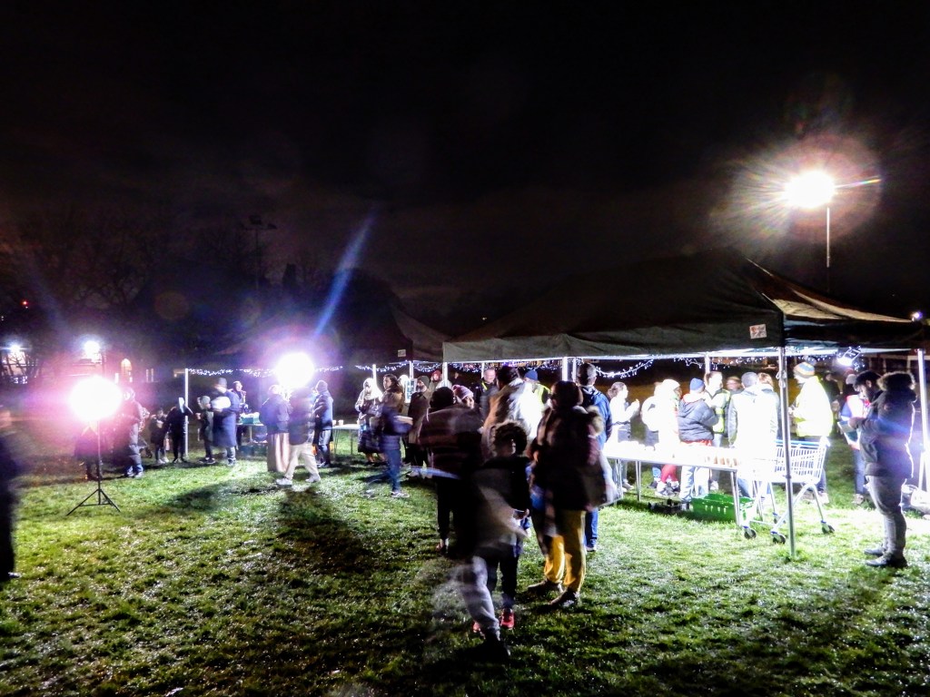 Over in Banstead Park, the tree was lit up, stalls were erected, and a karaoke set up to handle sound duties. Matt and the volunteers from FoodCycle were ferrying drinks and soups, as well as some fantastic bhaji. Pete C (whom I’ve known on Twitter for years but met for the first time today) was on mince pie duty.