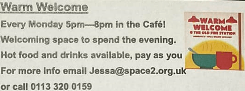 Just around the corner, this fantastic community facility for Gipton always has stuff going on, and every Monday from 5pm to 8pm, they are offering a warm space in their café