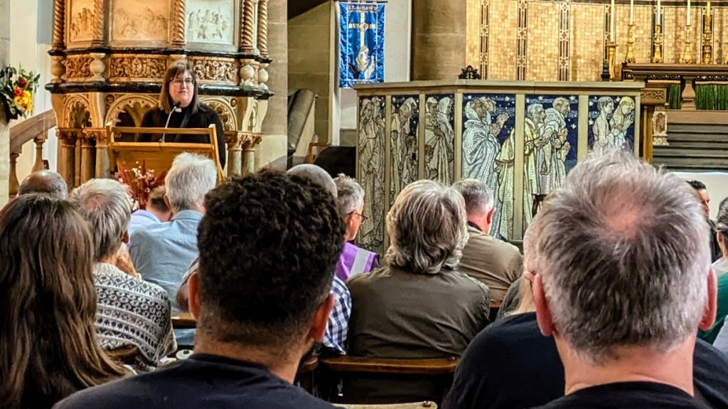 Reverend Sally Osborn of St. Aidan’s opened the evening with a powerful message, describing love as an active force that requires patience, bravery, and deep listening. Pastor Dan, a Romanian pastor serving the local Romanian community, echoed her sentiments, speaking through a translator to offer blessings of love and peace. “Romanian children go to the same schools as everyone else,” he emphasized, highlighting the shared experiences and friendships that connect communities. “We must show love and compassion.”