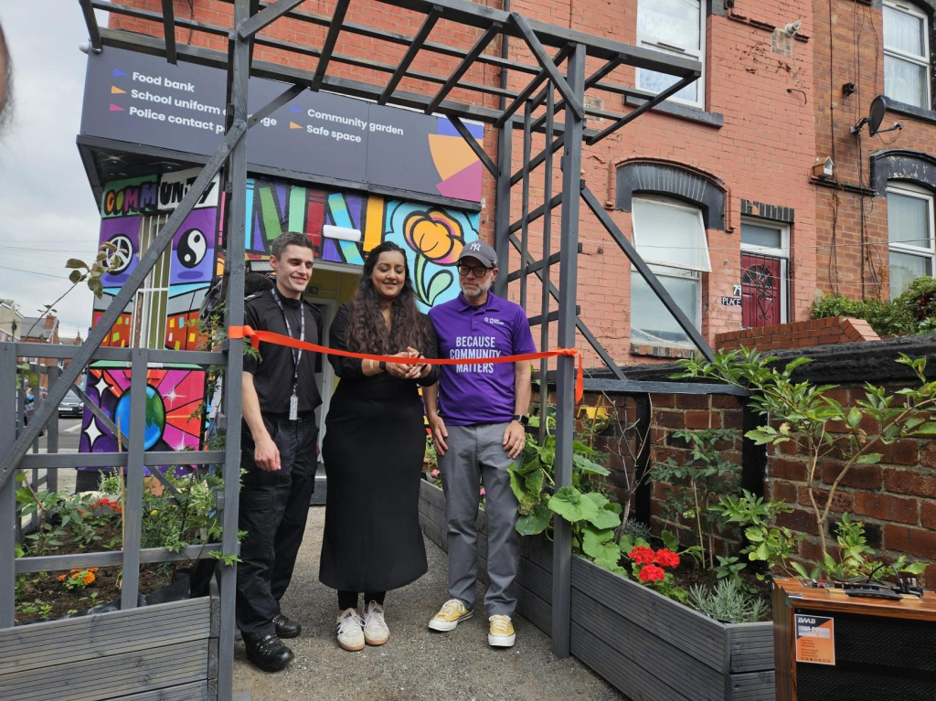 Councillor Salma Arif cutting the ribbon on the fantastic new community asset – credit: East Side Story (https://eastsidestory.co.uk/harehills-new-community-hub-supports-local-people-and-provides-police-contact-point/)