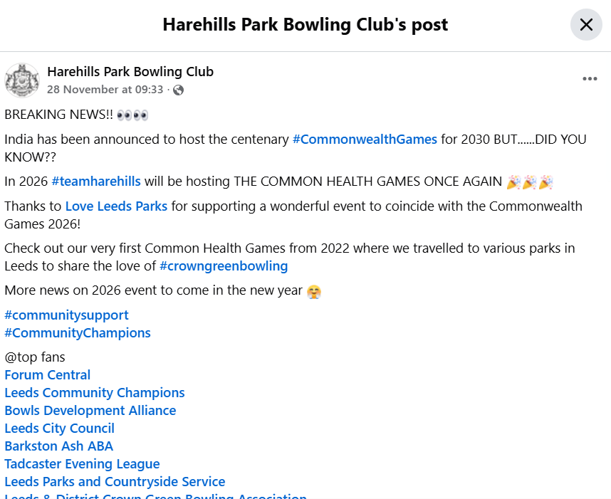 Looking to 2026 The good news continues into next year. We can reveal that in 2026, as part of #TeamHarehills, the club will host the Common Health Games. Supported by Love Leeds Parks, and coinciding with the Commonwealth Games, this event will build on the success of 2022 to celebrate health, sport, and our local green spaces.